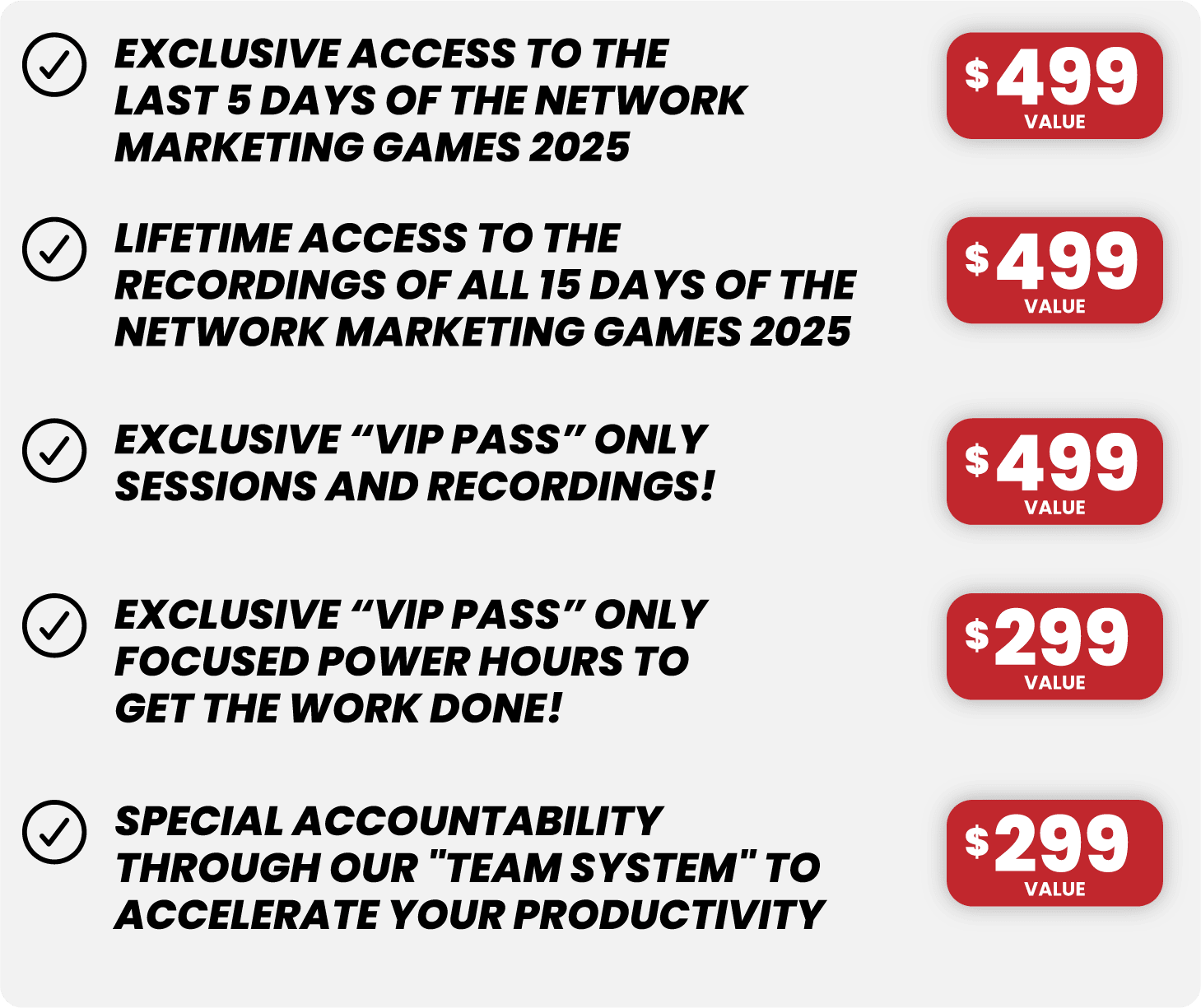 One Time Offer - Only $17 - Instead Of $197: Get Your Network Marketing Games Success Kit which includes the Official Challenge Workbook, The Challenge Scripts Pack, Official Content Calendar for 2025 AND The Activity Tracker to keep you on track. These 4 Assets will give you all you need to take action on the proven strategies that top performers are using today. This will give you the competitive edge to help you be more consistent, eliminate overwhelm and focus in on the basics to move your business forward in 2025 and beyond. This offer is not available anywhere else, at any time. Save $180.